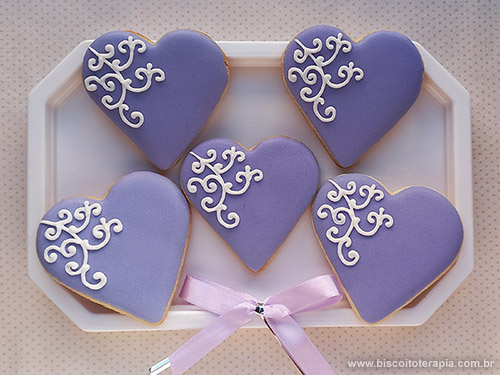Biscoito amanteigado de baunilha em formato de coração com uma base de glacê real na cor lilás. Projetei a imagem das filigranas sobre o biscoito, risquei com lápis (atóxico) os traços para guiar o meu traço e decorei com glacê branco em ponto firme e bico perlê número 0.