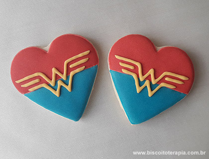 Para fazer os símbolos tanto do Batman quanto da Mulher Maravilha, usei um projetor sobre o biscoito, assim eles ficaram sempre na mesma proporção e mais certinhos.
