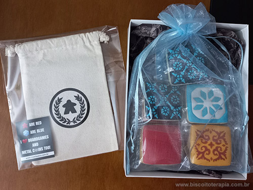 No jogo, os tiles ficam dentro de um saquinho e você tem que pegar um sem saber qual vai sair. Para o sorteio, eu quis colocar os biscoitos também dentro de um saquinho (obviamente azul, como o nome do jogo), mas escolhi um saquinho de organza transparente, para que a decoração ficasse visível. A segunda foto mostra o jogo.