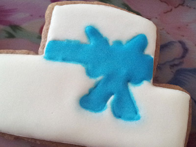 Esq: finalizei o calendário usando um bico fino para fazer essas pequenas cantoneiras na parte de baixo. Dir: e aqui eu mostro uma dica de algo muito comum que pode acontecer de ERRADO! Esse é um exemplo do que acontece com o biscoito quando você não espera o glacê secar totalmente para fazer a etapa seguinte. Muitas pessoas acham que o processo de decorar biscoitos é rápido, porém a verdade é que ele leva dias. Nesse caso da foto o ideal seria ter esperado 24h para o glacê branco estar totalmente seco, para só então preencher com o glacê azul... para mostrar o que aconteceria, eu não esperei e o glacê azul manchou o branco, o que deixou o biscoito com um aspecto bem feio no final. Então fica a dica: sempre espere o glacê estar BEM seco antes de usar outro glacê em consistência líquida encostado nele.