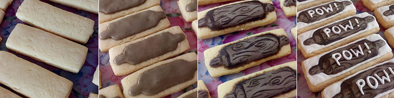 (1) Biscoitos de polvilho doce e leite condensado cortados em formato retangular fino (2) Contorno e preenchimento do formato do rolo, com glacê marrom (3) Com corante marrom e técnica aquarelável, pintei os riscos e efeitos de madeira no rolo (4) Com glacê branco escrevi o "Pow!" no centro