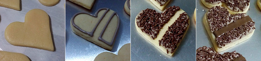 (1) Biscoitos de leite condensado cortados em formato de coração com aproximadamente 5,5 cm (2) Biscoitos assados com contorno e flooding em glacê marrom (3) Com o glacê ainda líquido o granulado foi jogado por cima (4) Com o glacê já duro, o cinturão foi preenchido com glacê marrom escuro em consistência de flooding.