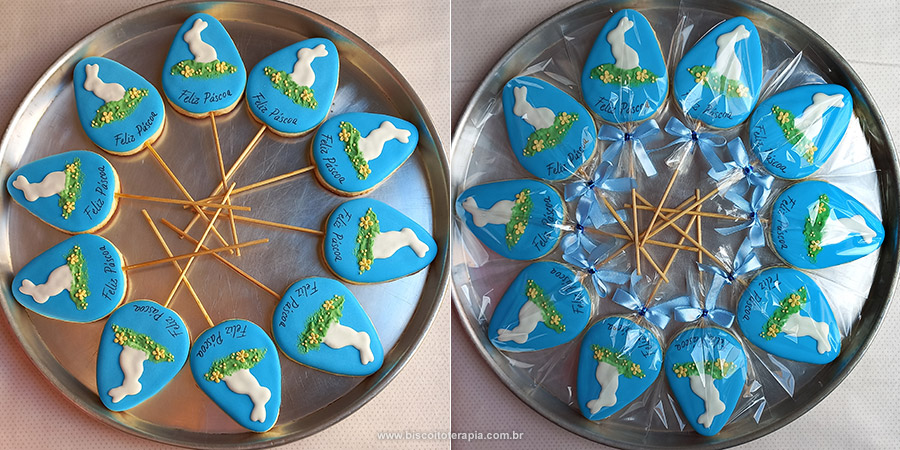 Biscoitos amanteigados de baunilha cortados em formato de ovo de páscoa bem grandão. Base com glacê fluido (rosa/azul). Com auxílio do projetor, desenhei a silhueta do coelhinho e escrevi o Feliz Páscoa com canetinha de corante alimentício. Com glacê branco em ponto médio preenchi o coelhinho com bastante cuidado. Depois de seco, usei glacê verde quase firme e dei batidinhas com o pincel para criar a textura de grama. Finalizei com glacê amarelo firme para criar as florzinhas na grama.