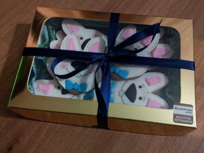 Nesse mês de junho recebi uma encomenda grande, com vários modelos diferentes de biscoitinhos decorados, então aos poucos vou colocando aqui no site o passo a passo de cada modelo. O primeiro modelo foi o de BICICLETA, e o segundo foi esse simpático coelhinho! Confesso que fazer qualquer bicho ainda é um desafio pra mim porque olhos, boca, expressão facial em si é algo delicado, já que um errinho, um traço errado, uma colocação um pouco mais perto ou mais distante pode mudar totalmente o resultado e deixar o bichinho ou muito fofinho ou assustador, heheh.
