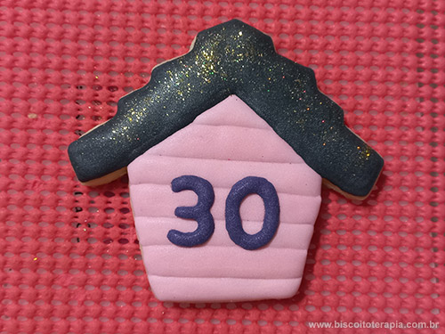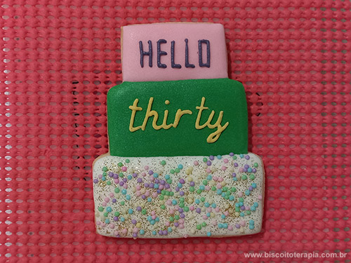O primeiro modelo foi uma forma simplificada de representar a casinha de boneca que dá origem a toda história do filme. A casinha completa (com janelas e porta) ficaria enorme então optamos pela versão simplificada, mostrando apenas as tábuas cor-de-rosa e o telhado que, claro, está repleto de Wishing Dust (ou glitter dourado comestível, no caso, hehehe). O segundo modelo aqui foi em formato de bolo de camadas, usando as cores da coleção, a mensagem de "Olá Trinta" e claro, mais glitter!