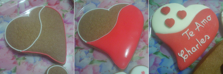 3) Para o coração com desenhos: contorno > flooding > borda. É uma pena que quando o glacê seca, os coraçõezinhos não fiquem tão bonitos quanto com o glacê líquido...
