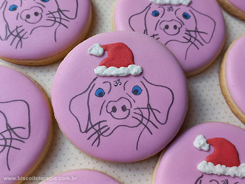 No passo a passo da decoração: biscoitão redondo, amanteigado de baunilha, com base de glacê fluido em rosa com um toque de azul. O cachorrinho simpático do logo foi passado para o biscoito com o auxílio de um projetor e feito com canetinha de corante comestível na cor preta. Preenchi o olho azul também com canetinha de corante. Finalizei com glacê fazendo o chapéu do Papai Noel, com consistência média no vermelho e consistência firme no branco (para criar essa textura irregular com volume).