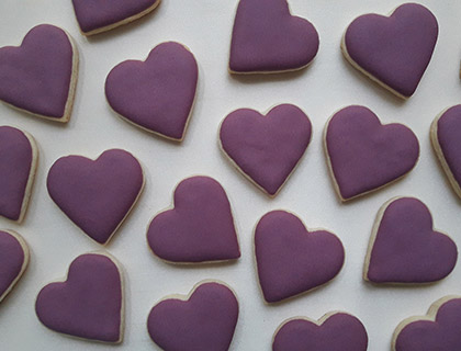 Na primeira foto essa cor de glacê foi conseguida usando uma mistura de corante vinho bordô com lilás, sou apaixonada por essa tonalidade chamada "rosa antigo". Na segunda foto os mini biscoitinhos de coração que fiz para acompanhar o logo.