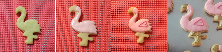 (1) Biscoito amanteigado cortado em formato de mini flamingo (2) Corpo do flamingo feito com glacê cor-de-rosa (3) Asa de coração feita com glacê rosa escuro (4) Patas e bico feitos com glacê amarelo e pintados de dourado
