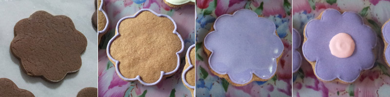 (1) biscoito de chocolate cortado com cortador em formato de flor (2) contorno com glacê lilás/rosa (3) flooding (4) flor lilás com miolo rosa feito com glacê em consistência de "20 segundos" (meio termo entre o glacê duro e o glacê de flooding)