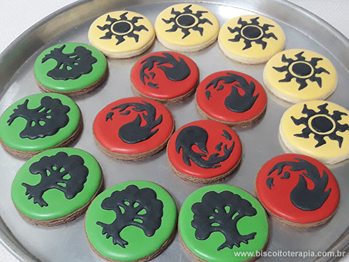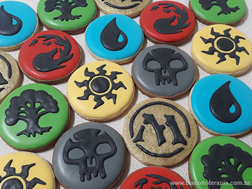 Ah, como eu adoro receber desafios!! No início de 2021 uma cliente/amiga me pediu para inventar algo usando o jogo "Magic: The Gathering" como tema, para o aniversário do genro dela. Eu nunca joguei Magic, só sabia que era um cardgame com muitos fãs e com grandes torneios pelo mundo, além de ter uma loja perto da minha casa INTEIRA dedicada ao jogo. Fui então para a internet pesquisar e, junto com a cliente, optamos pelos cinco símbolos de mana do jogo, todos em preto com fundos de cores diferentes, e eu aproveitei também para criar um outro modelo replicando o "M" do logo do jogo.