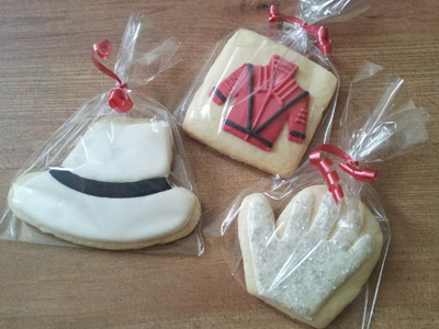 Para a luva de diamantes: (1) usei um cortador de luva de cozinha pois se fosse usar um de luva com os cinco dedos, o biscoito teria que ficar enorme ou correria o risco de quebrar (2) contorno com glacê branco e aqui é o desafio porque os dedos vão ter que ser desenhados à mão na hora com o glacê... eu acabei errando em alguns e fazendo o polegar muito grande e desproporcional (3) flooding com o glacê branco (4) com o flooding ainda líquido, joguei uma mistura de açúcar cristal comum (transparente) com açúcar cristal perolizado (que é um açúcar importado mas fácil de achar em lojas de confeitaria).