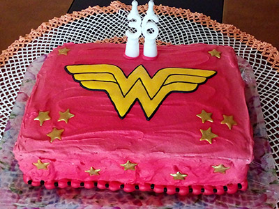 (1) A decoração foi finalizada preenchendo o símbolo com glacê amarelo líquido (e muito cuidado). Nessa foto tirada com outra iluminação dá para ver melhor o tom do vermelho e o contraste das cores no biscoitinho (a foto lá de cima foi tirada com muita luz, por isso não ficou muito legal). (2) Eu não sou especialista em bolos mas no meu aniversário desse ano além dos biscoitinhos resolvi colocar a Mulher Maravilha também no topo do bolo, usando a mesma técnica de contorno e flooding com glacê real, e aqui ainda acrescentei estrelinhas pintadas com corante dourado! E sim, meu bolo é 100% coberto com glacê real, coisa que 11 entre 10 confeiteiras se recusam a fazer, hehehe.
