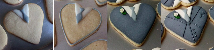 (1) Biscoitos amanteigados de baunilha cortados em formato de coração com aproximadamente 6,5 cm (2) Camisa branca e gravata cinza claro por cima (3) Flooding do terno com cinza escuro adicionando florzinha de confeito de açúcar (4) Detalhes finais na roupa com glacê duro cinza escuro