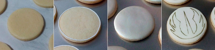 (1) Biscoito amanteigado de baunilha, cortado em formato redondo com aproximadamente 6 cm diâmetro (2) A parte fácil da decoração foi o contorno e o (3) flooding com glacê branco (4) Então veio a parte complicada do símbolo... primeiro eu fiz um molde simplificado do símbolo e risquei com canetinha de corante em cada um dos biscoitos