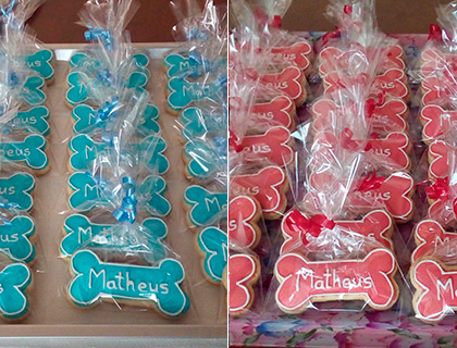 Conjunto final de biscoitinhos em formato de patinhas e de ossinhos com nome.