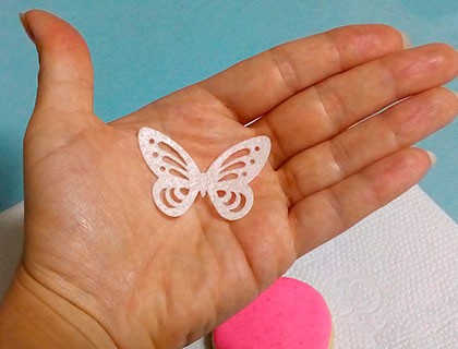 Eu confesso que apesar do papel arroz ser comestível, eu tenho uma aflição enorme de comê-lo... sinto que estou comendo um pedaço de guardanapo, mas resolvi experimentá-los nos biscoitos. Eu nunca havia trabalhado com papel arroz, não sabia qual lado deixar para cima nem como fixá-lo no biscoito, então fiz minha pesquisa básica na internet e resolvi testar usá-los sobre o glacê. Como eu tinha 3 biscoitinhos sobrando e um pouco de glacê rosa, passei o glacê sobre o biscoito sem muito esmero e fixei a borboleta pelo centro, forçando um pouco as asas para dar o efeito 3D.