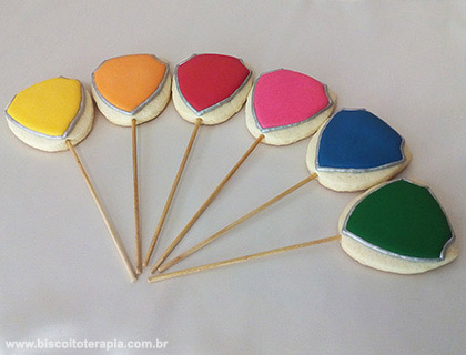 A encomenda pedia dois modelos de biscoitos: pirulitos com os escudos dos personagens e ossinhos com o número 6 e o desenho de patinhas (que podem ser vistos clicando aqui). Os pirulitos deram um trabalho enorme pois cada um tem uma cor diferente de fundo e características próprias em cada desenho, com muitos detalhes que precisam ser seguidos com precisão para ficarem iguais (ou o mais semelhante possível) aos do desenho, mas todo o trabalho é compensado pelo prazer da execução, de ver aquela paleta linda e colorida de glacê e de saber que as crianças da festa curtiram! =) Encomendas assim me enchem de alegria! Segue o passo a passo abaixo: