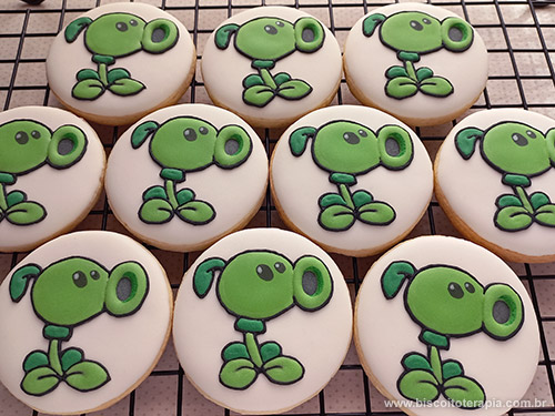 Plants versus Zombies é um joguinho que eu só conhecia de nome, então quando a cliente me pediu para fazer biscoitos nesse tema, fui dar uma boa pesquisada em imagens e referências, e acabamos definindo esses três modelos: o zumbi, o girassol e o lançador de ervilhas. No início ela me pediu para que os biscoitos tivessem o formato dos personagens, mas como eu não tinha cortador específico e recortar um a um na faca seria MUITO trabalhoso (pela quantidade total de biscoitos), sugeri fazê-los dentro de biscoitos redondos e assim ficou!