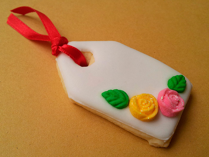 Esq: após o flooding adicionei confeitos prontos de açúcar fazendo uma moldura fofa pra tag. Dir: e passei uma fitinha de cetim no buraquinho, pra finalizar de forma bem delicada. O texto da tag pode ser escrito tanto com glacê quanto com canetinha de corante comestível.