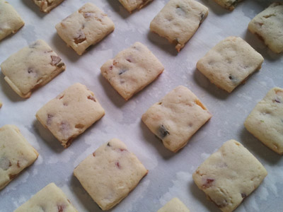 Esq: a massa aberta com as frutas cristalizadas que precisam estar bem picadinhas. Dir: biscoitos recém saídos do forno.