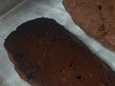 Esq: depois que a massa esfriar é só cortar em fatias... tomar cuidado nessa hora porque a massa parece um bolo duro e esfarela um pouco ao cortar, mas ver o chocolate derretido por dentro e sentir seu cheirinho vale toda a pena! =) Dir: espalhar as fatias na assadeira para assá-los pela segunda vez até ficarem no ponto certo.