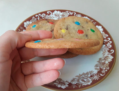 Já fiz alguns que deram certo e que ficaram deliciosos (e podem ser vistos nessa página), como o de goiabada, o de açúcar mascavo e o Floresta Negra, mas nenhum deles eu considero o cookie "original", aquele com o formato e consistência clássicos que a gente vê por aí. Pois em abril desse ano eu fiz mais uma tentativa e acreditei piamente que "agora vai". Mas não foi. E mais uma vez o cookie ficou super saboroso mas com o formato completamente errado.