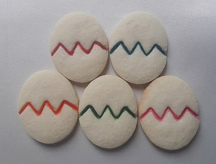 Montei 5 caixinhas de presente contendo 35 biscoitos sortidos em cada uma, sendo que os biscoitos de coelhinhos eram sabor mel e os de ovinhos quebrados eram amanteigados de baunilha. Para dar uma corzinha e deixar a caixinha mais feliz, fiz uma decoração "alternativa" nos dois modelos: nos coelhos desenhei olhos e bigodes usando canetinha de corante comestível, e nos ovinhos eu pintei o ziguezague com diversas cores de corante alimentício e gostei bastante do resultado final, simples mas extremamente fofo. A maioria das minhas encomendas é de biscoitos para lembrancinhas fechados em saquinhos individuais e às vezes eu esqueço o quanto eu adoro montar uma caixinha com vários biscoitos e enfeitá-la com laços e fitas!
