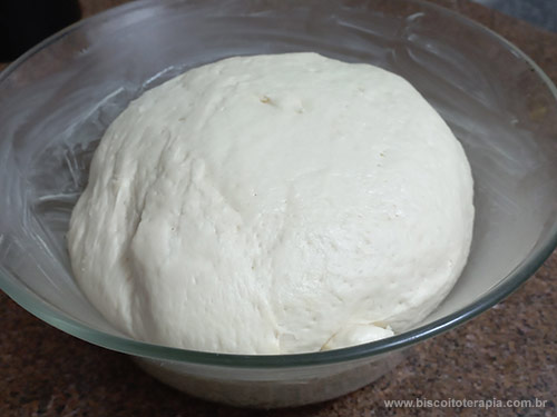 A massa é bem elástica e eu sugiro colocar um pouquinho de farinha de trigo a mais do que pede na receita para ela ficar mais firme. Porcionei a massa com pesos entre 30g e 35g, que rendeu no máximo 20 pãezinhos.